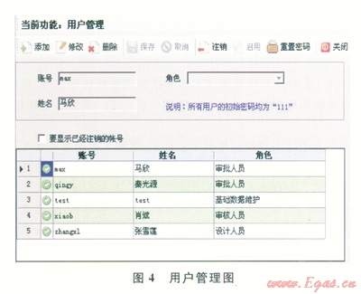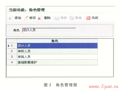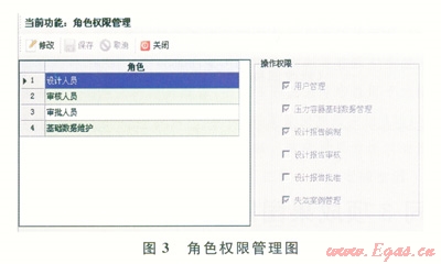 該系統(tǒng)分為角色管理、角色權(quán)限管理以及用戶管理3個(gè)部分。角色管理把使用系統(tǒng)的人員分為設(shè)計(jì)人員、審核人員、審批人員和基礎(chǔ)數(shù)據(jù)維護(hù)員(圖2)。這些人員能進(jìn)行的業(yè)務(wù)處理和所能查看的數(shù)據(jù)范圍各不相同,系統(tǒng)需要為每一個(gè)操作人員設(shè)立不同的賬號,系統(tǒng)為每個(gè)角色分配相應(yīng)的操作權(quán)限(圖3)。