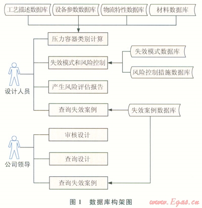 系統(tǒng)的設(shè)備工藝描述、設(shè)計(jì)參數(shù)、介質(zhì)特性、材料等基礎(chǔ)數(shù)據(jù)庫用于設(shè)計(jì)人員進(jìn)行壓力容器類別的計(jì)算,然后從失效模式數(shù)據(jù)庫、風(fēng)險(xiǎn)措施數(shù)據(jù)庫調(diào)用數(shù)據(jù)開展失效模式和風(fēng)險(xiǎn)控制判別,參照失效案例,產(chǎn)生壓力容器設(shè)計(jì)階段的風(fēng)險(xiǎn)評估報(bào)告,提交公司主管領(lǐng)導(dǎo)審核。上級公司主管領(lǐng)導(dǎo)在系統(tǒng)中進(jìn)行審核,必要時(shí)也能方便地調(diào)用失效案例數(shù)據(jù)進(jìn)行復(fù)核(圖1)。
