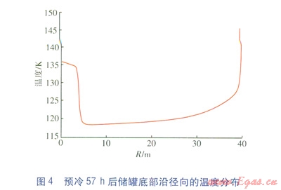點(0,0)處的溫度隨預(yù)冷時間的變化見圖3,預(yù)冷57h后儲罐底部沿徑向的溫度分布見圖4。從圖3可以看出,儲罐底部中心(即點(0,0)處)的溫度并不是隨著預(yù)冷過程的進行而一直降低的,當(dāng)儲罐底部溫度降低到一定程度后,底部中心出現(xiàn)了溫度不降反升的現(xiàn)象。從圖4也可以看出,底部中心區(qū)域的溫度高于其他位置(除靠近側(cè)壁處)。這是因為噴淋的液滴到達儲罐底面后,在底面氣化,產(chǎn)生的氣體無法及時沿底面向四周擴散,積聚在儲罐底部的中心區(qū)域,形成二次回流,二次回流阻礙了儲罐底面與內(nèi)部低溫氣體的對流換熱。同時,底部的混凝土向內(nèi)部的導(dǎo)熱還在繼續(xù),因此在二次回流區(qū)出現(xiàn)了溫度不降反升的現(xiàn)象。隨著預(yù)冷的繼續(xù),底部混凝土的熱量充分釋放,液滴在儲罐底面處的氣化量減小,產(chǎn)生的新氣體量減少,二次回流區(qū)逐漸被壓縮,底部中心區(qū)域的溫度又重新下降。