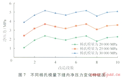 為進一步研究儲層巖石力學參數(shù)對應力陰影的影響,設置不同泊松比和楊氏模量進行研究??疾觳此?span lang="EN-US">0.2、0.35、0.45比時,結果表明泊松比對應力陰影的影響較小,即便在泊松比為0.5的極端情況下,導致的凈壓力變化幅度仍不大,因此產生的應力影響很小(圖6)。考察楊氏模量20000MPa、25000MPa、30000MPa等3種情況,研究表明:楊氏模量對裂縫內凈壓力值的變化影響較大,產生的應力陰影現(xiàn)象越強烈,楊氏模量越高對裂縫應力陰影效果影響也較大(圖7)。因此,儲層巖石力學參數(shù)中楊氏模量對應力陰影現(xiàn)象的影響最敏感。