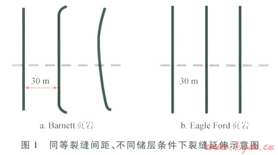 隨著工具設備及水平井改造技術的不斷進步,儲層多段改造的規(guī)模、段數(shù)等越來越多[8-9]。水力壓裂沒計師可利用分簇射孔將分段改造距離設置得越來越近,但往往過多的分簇與分段未必就帶來理想的效果,Roussel認為應力陰影效應的產生機理主要在于支撐劑的填充導致人工裂縫附近引起了應力場的變化,蔣廷學等也在研究我國頁巖氣壓裂設計中指出,壓裂在單一裂縫脆弱面上產生誘導應力的存在,并指出產生應力陰影的誘導應力可以改變最大與最小主應力的分布,使裂縫發(fā)生轉向[10]。述研究表明,應力陰影效應可引起人工裂縫從水平井的橫切縫中開始偏離朝向或遠離以前的裂縫方向延伸,使得下一裂縫發(fā)生轉向。Barnctt頁巖裂縫間距30m時水平井壓裂裂縫產生的應力陰影效應如圖1-a所示,可見從第二條裂縫開始裂縫出現(xiàn)了與主縫向切的裂縫系統(tǒng),而Eagle Ford頁巖壓裂的裂縫監(jiān)測情況,同樣是30m的裂縫間距沒有出現(xiàn)裂縫應力陰影效應(圖1-b)。因此研究陰影效應的產生機理,建立分析數(shù)學模型并進行其影響因素分析對水平井分段體積改造優(yōu)化設計及效果的提升具有重要研究與應用價值。