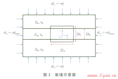 考慮裂縫平面上的應力變化,假設二維人工垂直裂縫(圖3)。