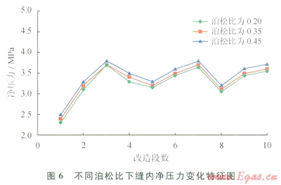 在給定儲層條件下變化水平主應力差值,考察水平主應力差值1MPa、3MPa、6MPa等3種條件對應力陰影的影響。結果表明:隨著應力差的增大凈壓力值變小,所形成的應力陰影效應也逐級變小,儲層應力差的越小,形成的誘導應力范圍越大,對鄰近段裂縫改造的陰影效應越大,導致裂縫間的相互作用越強,促使裂縫發(fā)生轉向,形成復雜裂縫網絡。