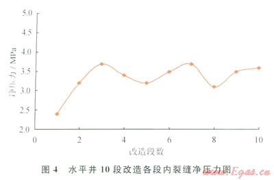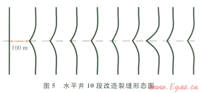 以某口致密儲層X水平井為例,水平段長度1043m,儲層有效孔隙度8%,有效滲透率0.12mD,地層孔隙壓力29.0MPa,楊氏模量25000MPa,泊松比0.2,最小水平主應力43.2 MPa,抗張強度3.5MPa。分段改造設計6~10段。利用上述數(shù)學模型計算水平井10段改造下不同段內的凈壓力及裂縫形態(tài)表明:100m的段間距內裂縫將發(fā)牛轉向(圖4、5)。
