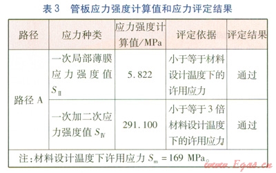 對于薄壁結(jié)構(gòu),JB 4732—1995《鋼制壓力容器——分析設(shè)計標準》(2005年確認)第5.3節(jié)給出了應(yīng)力強度的評定依據(jù):一次局部薄膜應(yīng)力強度值SⅡ小于等于1.5Sm;一次加二次應(yīng)力強度值SⅣ小于等于3Sm。對U形換熱管不存在管子對管板的彈性基礎(chǔ)作用,從管板系統(tǒng)安全裕度出發(fā),本工程SⅡ取小于等于1.0Sm。按照上述評判依據(jù),對計算應(yīng)力值與材料許用應(yīng)力值進行比較,從而完成應(yīng)力評定,確定結(jié)構(gòu)承壓條件下的安全性[3]。應(yīng)力評定結(jié)果見表3。
