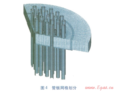 本例使用ANSYS軟件按表1尺寸建立有限元模型??紤]到管孔的對稱性,可建立l/3等效模型,見圖3。初步取管板厚度dn=68mm,其余結(jié)構(gòu)尺寸按表1選取。因換熱管采用焊接方式連接在管板上,建模時可以認為換熱管與管板已達到一體化程度,單元是相互連接的,不存在接觸問題。應(yīng)力邊緣效應(yīng)的影響長度公式為[2]: