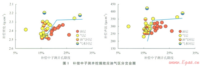 補(bǔ)償中子挖掘效應(yīng)方法認(rèn)為氣層補(bǔ)償中子孔隙度會降低,而聲波和密度視孔隙度會增高,因此氣層的補(bǔ)償中子孔隙度與聲波或密度視孔隙度之間會存在一定差異。然而不同氣層的地層壓力、含氫指數(shù)、密度等是有差別的[7];同時,泥質(zhì)含量的高低、儲層巖屑成分含量的變化等因素都會影響三孔隙度曲線,從而在一定程度上掩蓋氣的響應(yīng);另外砂泥巖地層中頻繁出現(xiàn)的擴(kuò)徑現(xiàn)象也會導(dǎo)致三孔隙度曲線質(zhì)量降低。圖1為補(bǔ)償測井挖掘效應(yīng)油氣區(qū)分交會圖,在井徑規(guī)則,三孔隙度曲線質(zhì)量合格的井段,有一定效果,但無法區(qū)分油氣同層。