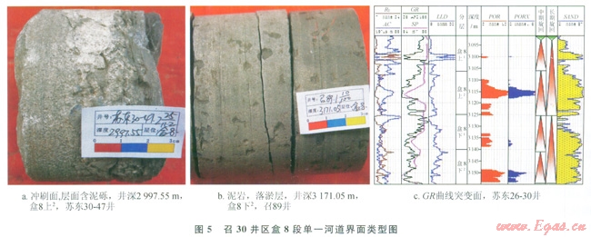 單一河道是指較長(zhǎng)周期的大洪水期形成的具有一定分布范圍的河道單元,其識(shí)別的意義在于復(fù)合河道內(nèi)垂向上的單一河道單元的劃分,每一期次洪水的流量、流速不盡相同。因此可以依據(jù)河道內(nèi)的泥質(zhì)層、細(xì)粒沉積的發(fā)育位置、沖刷面以及測(cè)井曲線的突變來(lái)對(duì)其進(jìn)行識(shí)別[20]。區(qū)內(nèi)單一河道的界面表現(xiàn)為(圖5):①?zèng)_刷面,代表洪水對(duì)前期沉積物的改造,多含泥礫;②泥巖及粉砂巖沉積,代表憩水期水體能量相對(duì)較弱時(shí)的細(xì)粒沉積,保存程度視后一期洪水能量的強(qiáng)弱而定;③測(cè)井曲線(GR)突變面。通過(guò)以上3種界面對(duì)召30井區(qū)盒8段短期基準(zhǔn)面旋回內(nèi)單一河道進(jìn)行識(shí)別,每個(gè)短期旋回內(nèi)均發(fā)育2~3期單一河道沉積。