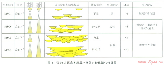 LSC2即盒8段上部層序由2個(gè)中期旋回(MSC3~MSC4)組成,底部旋回(MSC3)為向上變“深”的非對(duì)稱型,該中期旋回由2~3個(gè)(SSC7~SSC9)短期旋回組成,短期旋回由A型(向上“變深”非對(duì)稱型)向C型(對(duì)稱型)過(guò)渡,表明基準(zhǔn)面有所抬升,可容納空間增大;頂部旋回(MSC4)為以上升半旋回為主的不完全對(duì)稱型,此時(shí)源區(qū)構(gòu)造相對(duì)穩(wěn)定,物源供給量相對(duì)減少,基準(zhǔn)面抬升,可容納空間增大,A/S值大于1,該中期旋回由2~3個(gè)短期旋回組成(SSCl0~SSCl2)。