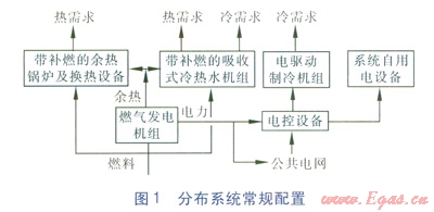 分布系統(tǒng)一般包括動力設(shè)備(主要為發(fā)電機組)、余熱利用設(shè)備(主要為帶補燃的余熱鍋爐、換熱設(shè)備、帶補燃的吸收式冷熱水機組等)、供配電設(shè)備(主要為電控設(shè)備等)、燃氣供應(yīng)設(shè)備、監(jiān)控裝置等,常規(guī)配置見圖1。在實際設(shè)計中,應(yīng)根據(jù)發(fā)電機組特性、用戶需求(熱電比、冷熱負荷特性)等多方面因素合理配置分布系統(tǒng),以實現(xiàn)能源的高效經(jīng)濟利用。