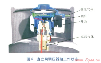 直立閥結(jié)構(gòu)見圖3,直立閥調(diào)壓器組工作狀態(tài)見圖4。與角閥相比,直立閥無外部手動開關(guān),借助內(nèi)部彈簧與鋼瓶內(nèi)壓自動關(guān)閉。直立閥通常處于自動關(guān)閉狀態(tài),只有裝上調(diào)壓器,并打開開關(guān),直立閥才能開啟。