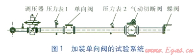 當(dāng)用戶用氣設(shè)備突然停機(jī),會造成調(diào)壓器出口管段內(nèi)壓力瞬間升高,其原因主要是用氣設(shè)備的切斷速度極快(切斷時(shí)間小于1s),而調(diào)壓器的閥口關(guān)閉速度慢(需3~4s),調(diào)壓器閥口關(guān)閉的響應(yīng)時(shí)間比用戶用氣設(shè)備切斷閥的切斷時(shí)間長,造成用戶用氣設(shè)備切斷后,調(diào)壓器上游還有少量氣體輸送至下游,造成下游管段壓力瞬間升高。如何抑制調(diào)壓器出口壓力的突然上升?本文從在調(diào)壓器出口管段上加裝單向閥、加裝安全放散閥以及調(diào)整用戶端用氣設(shè)備控制閥門的關(guān)閉程序等3個(gè)方面進(jìn)行試驗(yàn)研究。