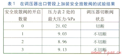 試驗(yàn)方法:調(diào)壓器進(jìn)口壓力設(shè)定為0.4MPa,出口壓力設(shè)定為7kPa,調(diào)壓器切斷閥的切斷壓力設(shè)定為9.8kPa,安全放散閥開啟壓力為8.4kPa。對不開啟安全放散閥、開啟l個(gè)安全放散閥、開啟2個(gè)安全放散閥及開啟3個(gè)安全放散閥這3種工況進(jìn)行試驗(yàn),觀察壓力表2的讀數(shù),試驗(yàn)結(jié)果見表1。