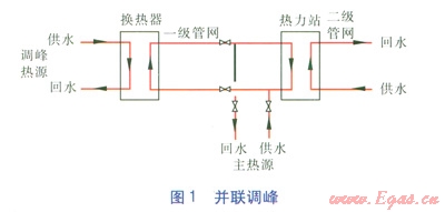 這種方式是目前國內(nèi)常見的調(diào)峰形式,考慮調(diào)峰熱源的相對位置及容量大小,又可細分為裂解調(diào)峰(調(diào)峰熱源與主熱源分別運行)和并聯(lián)調(diào)峰(見圖1)。并聯(lián)調(diào)峰是調(diào)峰熱源高溫熱水進入換熱器與主熱源一級管網(wǎng)循環(huán)水進行熱交換,使一級管網(wǎng)循環(huán)水升溫后輸送至各熱力站,與二級管網(wǎng)換熱。調(diào)峰熱源處于管網(wǎng)前端時,適宜裂解調(diào)峰;調(diào)峰熱源處于管網(wǎng)水力工況薄弱點時適宜并聯(lián)調(diào)峰,在滿足熱負荷的前提下,能改善管網(wǎng)末端水力工況。