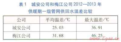天津市城安熱電有限公司(以下簡稱城安公司)和天津市梅江供熱公司(以下簡稱梅江公司)2012—2013年供暖期一級管網(wǎng)供回水溫差比較見表1。由表1可知,城安公司一級管網(wǎng)供回水溫差與梅江公司差距較大。