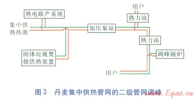 二級管網(wǎng)調(diào)峰多出現(xiàn)于東歐國家,比如丹麥集中供熱管網(wǎng)的調(diào)峰鍋爐設置(見圖3)就很有代表性[1-3]。