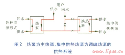 當今,多熱源熱泵技術(shù)日臻成熟,太陽能、風能、污水、土壤等眾多熱源均可作為低品質(zhì)熱源,通過熱泵轉(zhuǎn)換為高品質(zhì)熱源供熱。因此,在天津市能源集團“全市一網(wǎng)”戰(zhàn)略部署中,設置大型熱泵能源站,以熱泵為主熱源承擔廣大熱用戶的基本負荷,以集中供熱的熱水為調(diào)峰熱源,在尖峰時段加熱熱泵低溫熱水,充分利用熱泵能源的同時,也大大減小了集中供熱的一級管網(wǎng)流量,為實現(xiàn)集中供熱大規(guī)?;?、更多地搶占供熱市場份額起到了至關(guān)重要的作用。熱泵為主熱源、集中供熱熱源為調(diào)峰熱源的供熱系統(tǒng)見圖2。