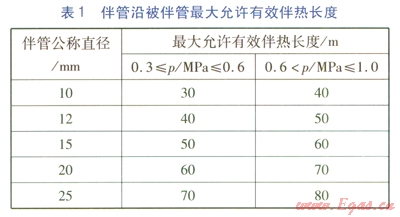 伴管沿被伴管的最大允許有效伴熱長(zhǎng)度按表1確定,表1中p為蒸汽壓力。