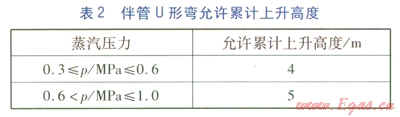 由于被伴管常采用U形補(bǔ)償,以及受到安裝現(xiàn)場(chǎng)實(shí)際條件制約,伴管出現(xiàn)U形彎是不可避免的。U形彎的出現(xiàn)將增加伴管的阻力,易產(chǎn)生氣阻和液阻。因此,《規(guī)范》對(duì)伴管U形彎允許累計(jì)上升高度進(jìn)行了規(guī)定,見(jiàn)表2。
