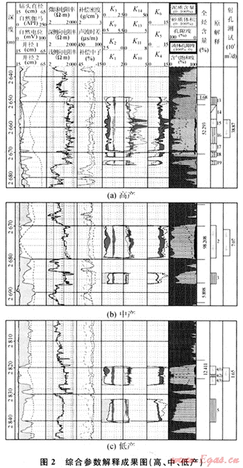 由交會(huì)圖和高、中、低產(chǎn)綜合參數(shù)的統(tǒng)計(jì)分析,可以得出高、中、低產(chǎn)產(chǎn)能劃分標(biāo)準(zhǔn)(表2)。圖2為高、中、低產(chǎn)層的綜合特征解釋成果圖。