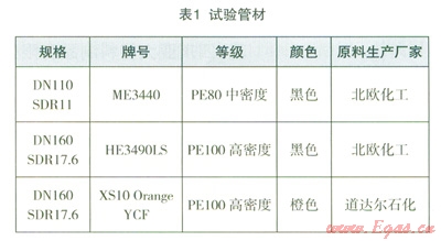 為了驗(yàn)證不同等級(jí)及有無(wú)炭黑聚乙烯燃?xì)夤懿牡奈潭?、?duì)接焊麻點(diǎn)出現(xiàn)程度及其影響大小,該試驗(yàn)分別選取了中密度聚乙烯原材料ME3440(含炭黑)、高密度聚乙烯原材料HE3490LS(含炭黑)及橙色高密度聚乙烯原材料XSl0 Orange YCF(不含炭黑)生產(chǎn)出的管材(詳見(jiàn)表1);為保證水份充分滲透,將管材浸泡在常溫水中,浸泡時(shí)間為2年。