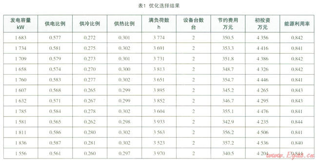 以10萬m2酒店建筑為例,采用分布式能源系統(tǒng)優(yōu)化計算軟件,綜合考慮能源利用效率、節(jié)約運(yùn)行費(fèi)用、初投資、機(jī)組滿負(fù)荷時數(shù)等因素后,得到的不同發(fā)電容量下的方案排序如表1所示。