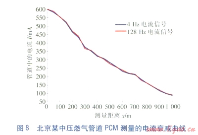 從圖8可以看出,在野外環(huán)境中,受到干擾較小,4Hz和128Hz的電流衰減曲線基本一致,沒有出現(xiàn)較大波動的情況。利用評估軟件對燃氣管道的防腐層面電阻率進行計算,4Hz電流信號的防腐層平均面電阻率的計算結果為8264W·m2;128Hz電流信號的防腐層面電阻率的計算結果為8697W·m2。對照組的實驗結果表明,在干擾較小的情況下,4Hz電流信號和128Hz電流信號的檢測結果差異不大。