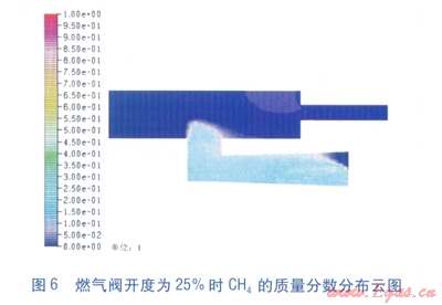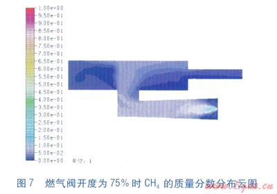 圖6、7為沿爐腔排氣導(dǎo)管軸線縱截面(即y=0平面)內(nèi)CH4的質(zhì)量分?jǐn)?shù)分布云圖,單位為l。當(dāng)燃?xì)忾y開度為25%時(shí),燃?xì)鈬娚渌俣容^低,引射管內(nèi)CH4的質(zhì)量分?jǐn)?shù)較大,說明燃?xì)獾靡栽谝涔軆?nèi)和空氣預(yù)混充分,然后進(jìn)入爐腔內(nèi)點(diǎn)火燃燒。當(dāng)燃?xì)忾y開度為75%時(shí),燃?xì)鈬娚渌俣容^高,引射管內(nèi)CH4的質(zhì)量分?jǐn)?shù)比燃?xì)忾y開度為25%狀態(tài)低了很多。