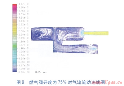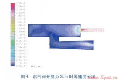利用FLUENT軟件對(duì)比模擬了燃?xì)忾y開度為25%和75%兩種條件下爐腔內(nèi)的氣體流動(dòng)狀態(tài)。計(jì)算得出兩種狀態(tài)下整個(gè)爐腔內(nèi)氣流的最高流速分別為24.61m/s和46.86m/s。高速流主要出現(xiàn)在爐腔排氣導(dǎo)管。