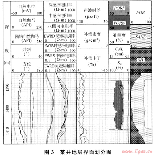 根據(jù)前面得知界面處電阻率極大值位置偏向高阻層的內(nèi)部,通過(guò)對(duì)實(shí)際測(cè)井資料分析發(fā)現(xiàn)一般界面離“極化角,,距離為0.5~1m,再結(jié)合其他的測(cè)井曲線一般可以正確劃分出儲(chǔ)層界面。