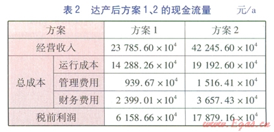 達(dá)產(chǎn)后方案1、2的現(xiàn)金流量見表2。居住建筑熱價(jià)為18元/(m2·a),公共建筑熱價(jià)為22元/(m2·a),公共建筑冷價(jià)為26元/(m2·a)。經(jīng)營收入主要為熱費(fèi)和冷費(fèi)收入??偝杀痉譃檫\(yùn)行成本、管理費(fèi)用、財(cái)務(wù)費(fèi)用。運(yùn)行成本包括從熱電廠購熱成本、電費(fèi)、水費(fèi)、水處理藥劑費(fèi)、修理費(fèi)、折舊費(fèi)、人工費(fèi)等;管理費(fèi)用包括公司經(jīng)費(fèi)、工資性管理費(fèi)用等;財(cái)務(wù)費(fèi)用包括流動(dòng)資金利息支出、長期借款利息支出等。
