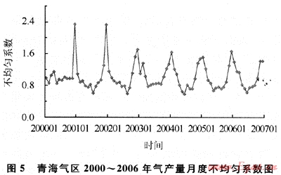 近幾年由于受國(guó)家經(jīng)濟(jì)宏觀調(diào)控政策和城市環(huán)保要求提高等因素的影響,民用、發(fā)電等用氣增長(zhǎng)較快,但民用和采暖用氣的季節(jié)性不均勻問(wèn)題突出,冬季高月和夏季低月值相差很大。中國(guó)石油每年的1、2、3、10、11、12等6個(gè)月的不均勻系數(shù)偏大(不均勻系數(shù)為月產(chǎn)量與年均月產(chǎn)量的比值),最高為12月份,連續(xù)6a的12月不均勻系數(shù)都在1.2以上,2005年不均勻系數(shù)達(dá)到了1.54的高峰,峰谷差為1.3~1.5倍(圖3)[4~5]。