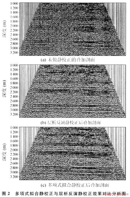 和max|δi|,如果在事先給定的誤差范圍內(nèi),則認為擬合有效。實際中往往采用二次或三次多項式擬合來求取近地表速度。處理結(jié)果表明:用多項式擬合求取表層速度的靜校正法在沙漠地區(qū)是切實可行的,為沙漠地區(qū)表層速度的求取提供了新.的途徑。