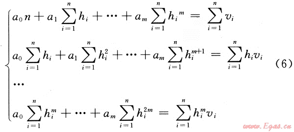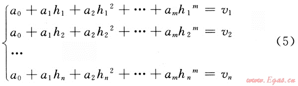 必須做的是要確定其中的系數(shù)a0,a1,…,am。將n對數(shù)據(jù)(vi,hi)代入式(4),就得到一個具有m+1個未知數(shù)ai的n個方程的矛盾方程組: