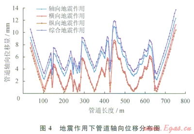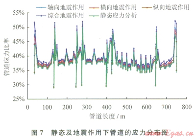 圖4~6為地震作用下管道軸向、橫向及縱向位移沿管長的分布情況,圖7為靜態(tài)及地震作用下應(yīng)力沿管長的分布情況,由圖4~7可以得出以下結(jié)論: