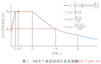 頻譜分析法中頻譜的設(shè)計(jì)與取值通常參照美國土木工程師學(xué)會(huì)ASCE 7—05《建筑物和其他結(jié)構(gòu)的最低設(shè)計(jì)載荷規(guī)范》(Minimum Design Loads for Buildings and Other Structures)[14],相對我國的GB 50011《建筑抗震設(shè)計(jì)規(guī)范》其取值較為保守[]15]。圖1為ASCE 7規(guī)范的設(shè)計(jì)反應(yīng)譜示意圖,它的周期區(qū)間分為4個(gè),不同的區(qū)間所對應(yīng)的反應(yīng)譜加速度計(jì)算公式不同(圖1中列出),其中,SDS和SD1用于選擇抗震設(shè)計(jì)類別和分析方法。