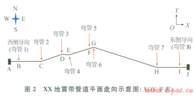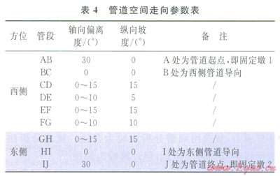 管道總長度約為780m,起點(diǎn)和終點(diǎn)分別設(shè)置固定墩l、2,用以截?cái)嘌芯繉ο笸夤艿缹δP偷挠绊?。西?cè)進(jìn)土導(dǎo)向B前有30m長的管段,與入土處有30°的偏離;西側(cè)水平管段長約為110m,斜管總長約為215m;東側(cè)出土導(dǎo)向工后有30m長的管段,與出土處有30°的偏離;東側(cè)水平管段長為105m,斜管長約為290m。管道均采用大開挖的敷設(shè)方式,彎管的曲率半徑(R)為6D(D為管道外徑),地區(qū)等級(jí)為l級(jí),設(shè)計(jì)系數(shù)為0.72。管道為空間結(jié)構(gòu),在X、Y、Z方向上均有長度分量,其在XOY平面上的走向如圖2所示,具體空間參數(shù)如表4所示。
