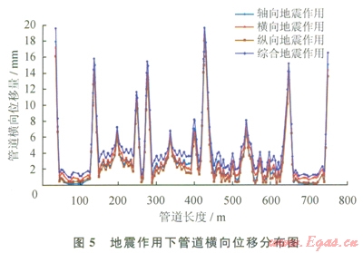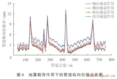 1)軸向、橫向、縱向及綜合地震作用對管道的橫向位移影響最大,且最大橫向位移明顯高于最大軸向及縱向位移,說明輸氣管道在穿越地震帶時(shí),應(yīng)重點(diǎn)對管道的橫向位移量進(jìn)行監(jiān)測。