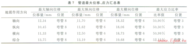 5)綜合地震作用所產(chǎn)生的管道位移、應(yīng)力較任一單方向地震作用高,說明綜合地震載荷對管道的破壞最大。