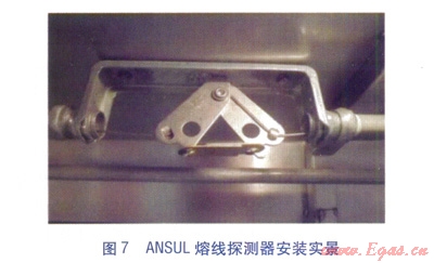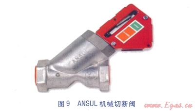 ⑥機械切斷閥(見圖9)。安裝于廚房燃?xì)饪傞y下游燃?xì)夤艿郎希?dāng)ANSUL系統(tǒng)啟動時,機械切斷閥由鋼絲繩索控制而關(guān)閉,切斷廚房燃?xì)夤?yīng),經(jīng)手動復(fù)位。