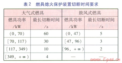 在工程實踐中,要求在燃具的每個燃燒器上都設(shè)置獨立的熄火保護裝置。另外,熄火保護裝置從檢測到?jīng)]有火焰到給出有效信號切斷燃?xì)夤?yīng)的整個操作過程必須是在安全合理的時間內(nèi),因為此操作過程時間過長,燃具泄漏的燃?xì)膺^多,危險性過高,保護裝置就失去了意義。對于不同類型及功率燃具的熄火保護裝置的最長切斷時間,澳門地區(qū)的相關(guān)燃?xì)夥ㄒ?guī)要求見表2。