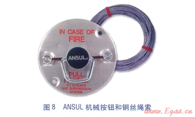 ⑤機械按鈕(見圖8)。是手動啟動滅火系統(tǒng)的操作工具,通過鋼絲繩索管連接到釋放裝置。機械按鈕拉環(huán)設(shè)計成允許三個手指操作,并有紅色字樣標(biāo)志,方便快速辨認(rèn)。