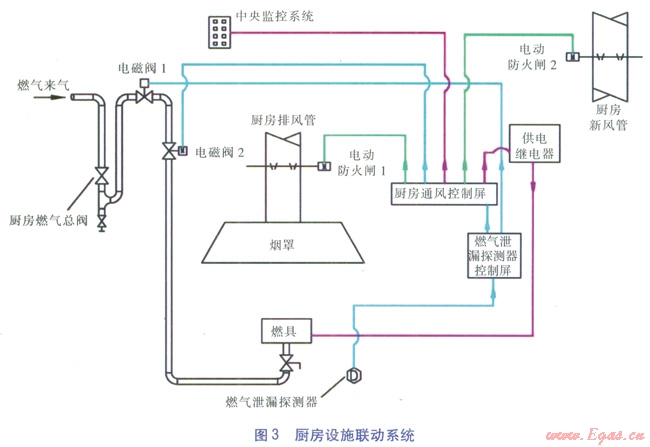 由于在商業(yè)廚房內(nèi)安裝燃?xì)庠O(shè)施種類及數(shù)量較多,需要防止燃?xì)庑孤?,同時在廚房火災(zāi)發(fā)生時,若有燃?xì)庵紕t火災(zāi)更加難以控制,造成的災(zāi)難更大。基于安全準(zhǔn)則,工程實踐中,通常在商業(yè)廚房的燃?xì)饪傞y的下游設(shè)置一組電磁閥,與燃?xì)庑孤┨綔y器、廚房通風(fēng)管道內(nèi)的電動防火閘、供電繼電器聯(lián)動。當(dāng)燃?xì)庑孤┨綔y器偵測到泄漏發(fā)生時,發(fā)出報警,電磁閥關(guān)閉、電動防火閘關(guān)閉、供電繼電器切斷廚房燃具電源。由上述設(shè)備組成的廚房聯(lián)動系統(tǒng)同時切斷了可燃物燃?xì)?、助燃物空氣的供?yīng)以及消除可能存在的點火源。電動防火閘的關(guān)閉則更是可以遏制火災(zāi)經(jīng)通風(fēng)管道向其他地方蔓延。廚房設(shè)施聯(lián)動系統(tǒng)見圖3。