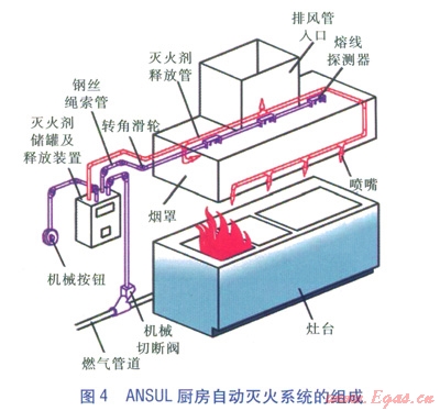 ANSUL廚房自動滅火系統(tǒng)的工作原理如下:廚房著火導(dǎo)致布在廚房保護區(qū)(即灶臺、煙罩及其排風(fēng)管入口附近等火災(zāi)危險區(qū))的探測器熔線斷開,引發(fā)連接在探測器上的鋼絲繩索松開,滅火劑釋放裝置啟動,打開動力氣筒,釋放出高壓氣體進入滅火劑儲罐,把滅火劑壓出并通過釋放管道輸送至噴嘴噴向保護區(qū),同時釋放裝置控制鋼絲繩索關(guān)閉機械切斷閥。ANSUL廚房自動滅火系統(tǒng)的組成見圖4。