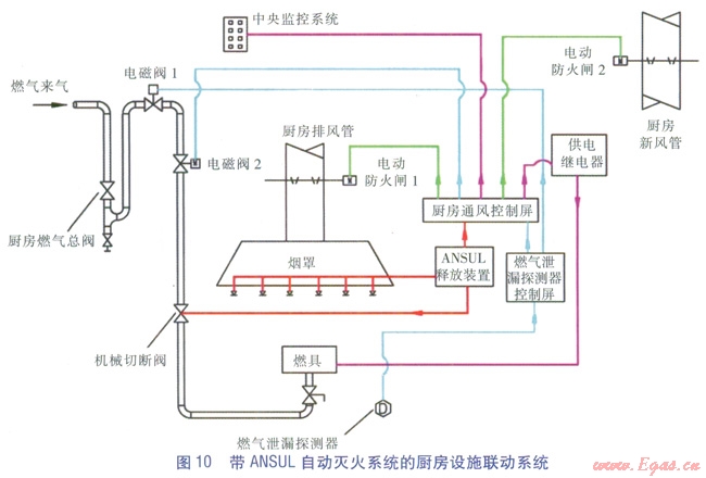 對于基于燃?xì)庑孤┨綔y的聯(lián)動的缺陷,我們不敢掉以輕心,經(jīng)過與設(shè)計團隊中消防工程師進行深入的探討,以及咨詢?nèi)季邚S商的專業(yè)意見,針對商業(yè)廚房的特性,在進一步的工程實踐中,在廚房增設(shè)ANSUL自動滅火系統(tǒng),燃?xì)夤?yīng)系統(tǒng)與之聯(lián)動,而不僅僅是設(shè)置電磁閥與燃?xì)庑孤┨綔y器。