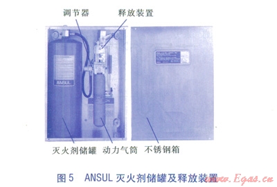 ②調(diào)節(jié)型釋放裝置。屬于一種裝有彈簧的機械、氣動釋放裝置,配置一個儲存二氧化碳或氮氣的動力氣筒,向滅火劑儲罐提供動力氣供應(yīng),氣筒上安裝有調(diào)節(jié)器,氣筒的密封層設(shè)計成由釋放裝置擊穿。釋放裝置由熔線探測系統(tǒng)進行自動啟動,釋放裝置還可以通過鋼絲繩索連接設(shè)置在保護區(qū)以外的機械按鈕進行遙控手動開啟,另外可與大廈中央監(jiān)控系統(tǒng)的連接線兼容,將有關(guān)信號自動傳輸?shù)酱髲B中央監(jiān)控系統(tǒng)。ANSUL滅火劑儲罐及釋放裝置見圖5。
