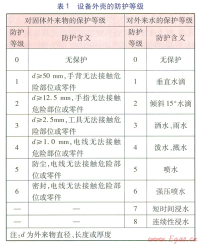 國際防護符號IP,即Ingress Protection Rating(防護等級),或International Protection Rating(國際保護等級),表示裝置外殼的防護等級,由IP和后續(xù)的兩位數(shù)字組成。第一個數(shù)字為0~6,表示對固體外來物的保護等級,第二個數(shù)字為0~8,表示對外來水的保護等級,數(shù)字越大表示防護等級越高。國際電工技術(shù)委員會(International Eleetroteehnical Commission,IEC)標(biāo)準(zhǔn)IEC 529《外殼所提供的保護等級》(Degrees of Protection Provided by Enclosure)的相關(guān)規(guī)定見表1。