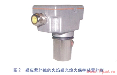 火焰感光熄火保護裝置利用火焰的光特性,采用感光式電子火焰?zhèn)鞲衅鳎栈鹧孑椛鋸姸雀叩募t外線或紫外線,來探測或掃描火焰。代表火焰信號的初始電流經(jīng)放大后推動執(zhí)行繼電器。該類型熄火保護裝置的特點是探測器分辨火焰輻射來獲得正確的火焰信號,不需要接觸火焰,配置探頭變得很簡單。不需要火焰電極,探頭在高溫下不退化。另外,由于所有熱的物質(zhì)都向外輻射紅外線,感應(yīng)紅外線的火焰檢測裝置存在缺點,即難以區(qū)分究竟是火焰輻射還是燃燒室受熱表面輻射(即使火焰熄滅),因此火焰檢測裝置的設(shè)計優(yōu)選感應(yīng)紫外線。感應(yīng)紫外線的火焰感光熄火保護裝置見圖2。