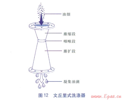 文丘里式洗滌器(見圖l2)由三段組成:漸縮段、咽喉段和漸擴段。把油煙氣流壓入文丘里式洗滌器,當(dāng)油煙進入漸縮段后,流速增大,進入咽喉段時達到最大值。洗滌液噴霧則從咽喉段加入,將其清洗。在漸擴段,流速減小,壓力回升,油煙粒子凝聚成直徑較大的液滴,進而被收集。