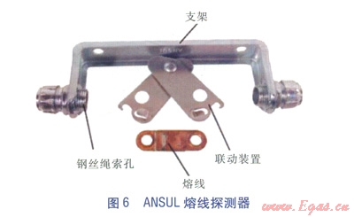④熔線探測器(見圖6)。熔線探測器布置在保護區(qū)的上方,通過額定溫度的合金熔線進行自動探測,當(dāng)溫度超過額定溫度時,熔線斷開,鋼絲繩索松開。其安裝圖見圖7。
